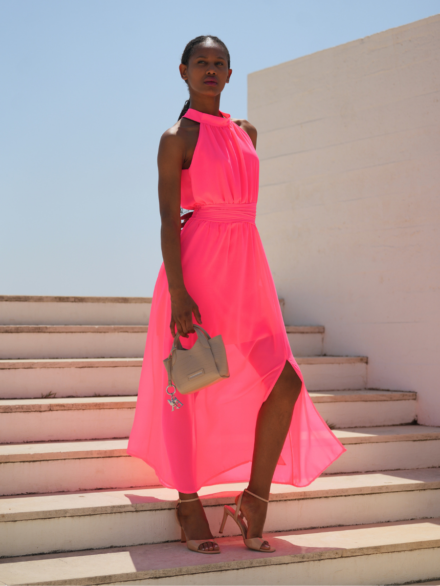 O vestido que acende qualquer verão. Com um tom fúcsia vibrante, gola halter estruturada e cintura marcada com faixa larga, este modelo realça a silhueta e garante movimento a cada passo graças à saia fluida com abertura frontal. O tecido leve e o fecho atrás do pescoço completam o look com elegância e conforto. Ideal para eventos ao pôr do sol ou para marcar presença com estilo.