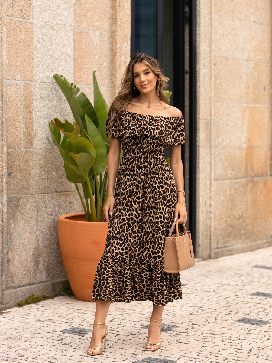 Com um charme selvagem e feminino, este vestido animal print é a peça statement que faltava no teu guarda-roupa. O decote em barco com efeito drapeado realça os ombros de forma delicada, enquanto o corte justo na zona do busto com efeito smock garante conforto e valorização da silhueta. A saia com ligeiro volume e folho na bainha cria um movimento fluido e descontraído, ideal para dias quentes e ocasiões especiais. Um modelo versátil que tanto pode ser usado com sandálias rasas durante o dia como com saltos para um look de impacto à noite.
