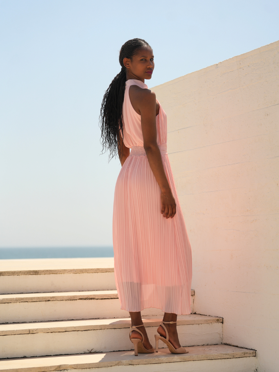 Leve, fluido e absolutamente elegante — este vestido rosa claro é tudo o que precisas para marcar presença nos dias de verão. Com corte midi e tecido plissado, destaca-se pelo decote halter com gola estruturada e costas ligeiramente abertas. A cintura elástica proporciona conforto e um ajuste perfeito. Ideal para eventos ao pôr do sol, jantares especiais ou até como convidada de cerimónia.