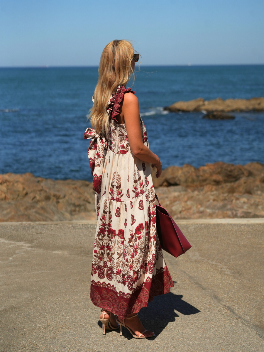 Vestido comprido em tecido leve com estampado floral e paisley em contraste. Modelo de corte fluído com decote reto e alças largas franzidas. Costas com abertura com laçada ajustável. Saia de várias camadas com leve efeito rodado. Estilo boémio e elegante ideal para os dias quentes.