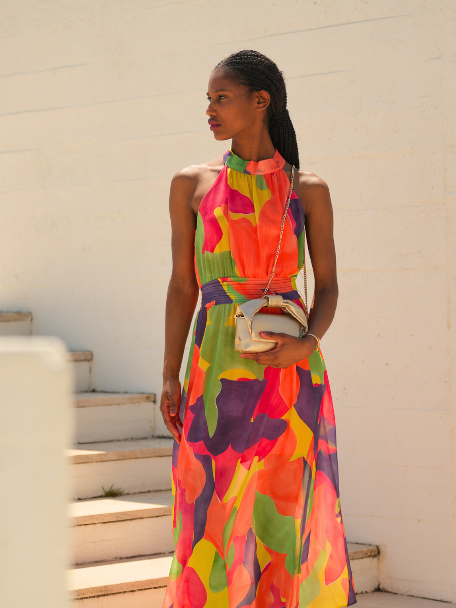A energia do verão cabe toda neste vestido. Em tecido leve e fluido, este modelo comprido destaca-se pelo estampado vibrante em tons de laranja, rosa, amarelo, verde e roxo, perfeito para um look ousado e fresco. A gola subida confere elegância, enquanto a cintura elástica realça a silhueta de forma confortável. O corte fluido com movimento garante leveza a cada passo — ideal para dias quentes, férias e festas ao pôr do sol. Fecha com botão na nuca.