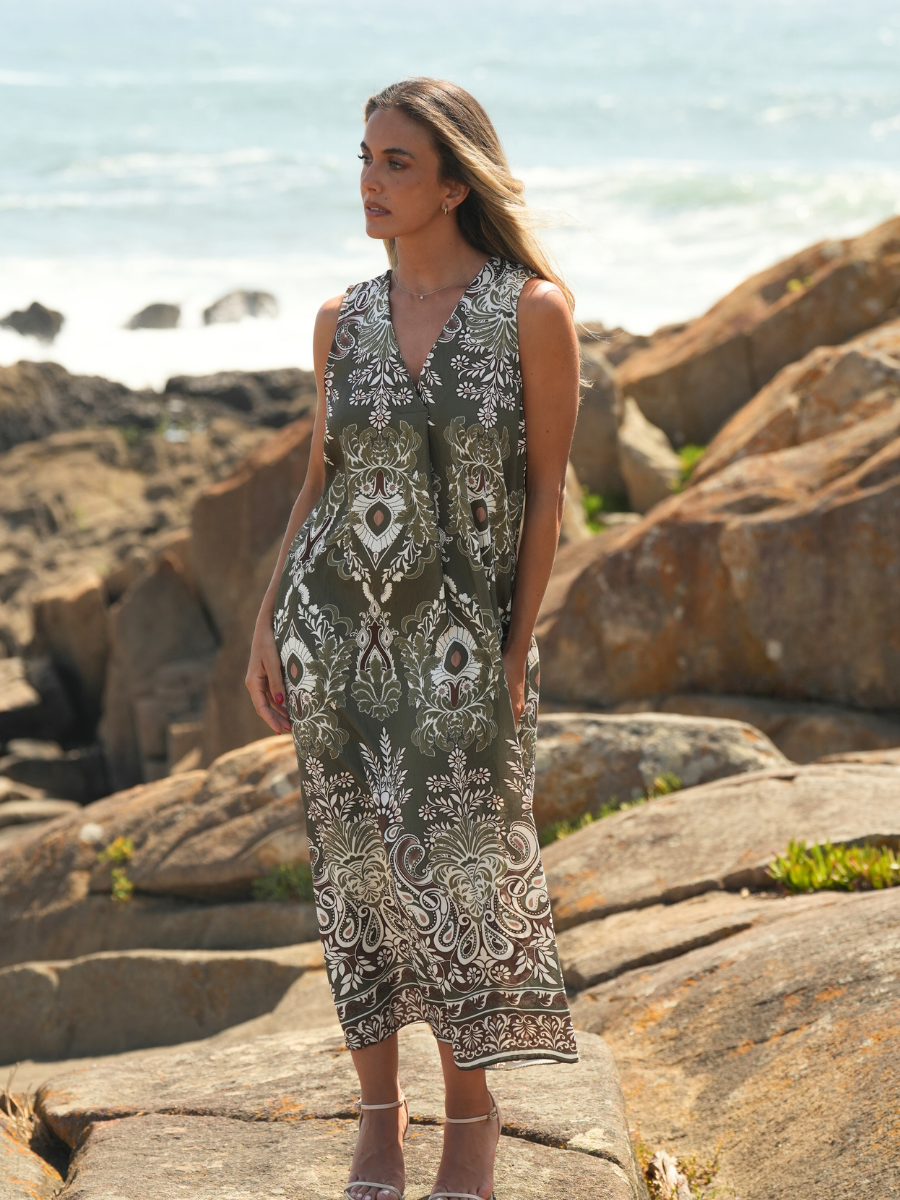 Este vestido midi combina elegância minimalista com conforto absoluto. Com corte solto e decote em V, destaca-se pelo franzido subtil nas costas que afina a silhueta sem marcar. Um essencial versátil para dias quentes, ideal tanto para coordenados descontraídos como para um look mais cuidado com sandálias ou saltos.