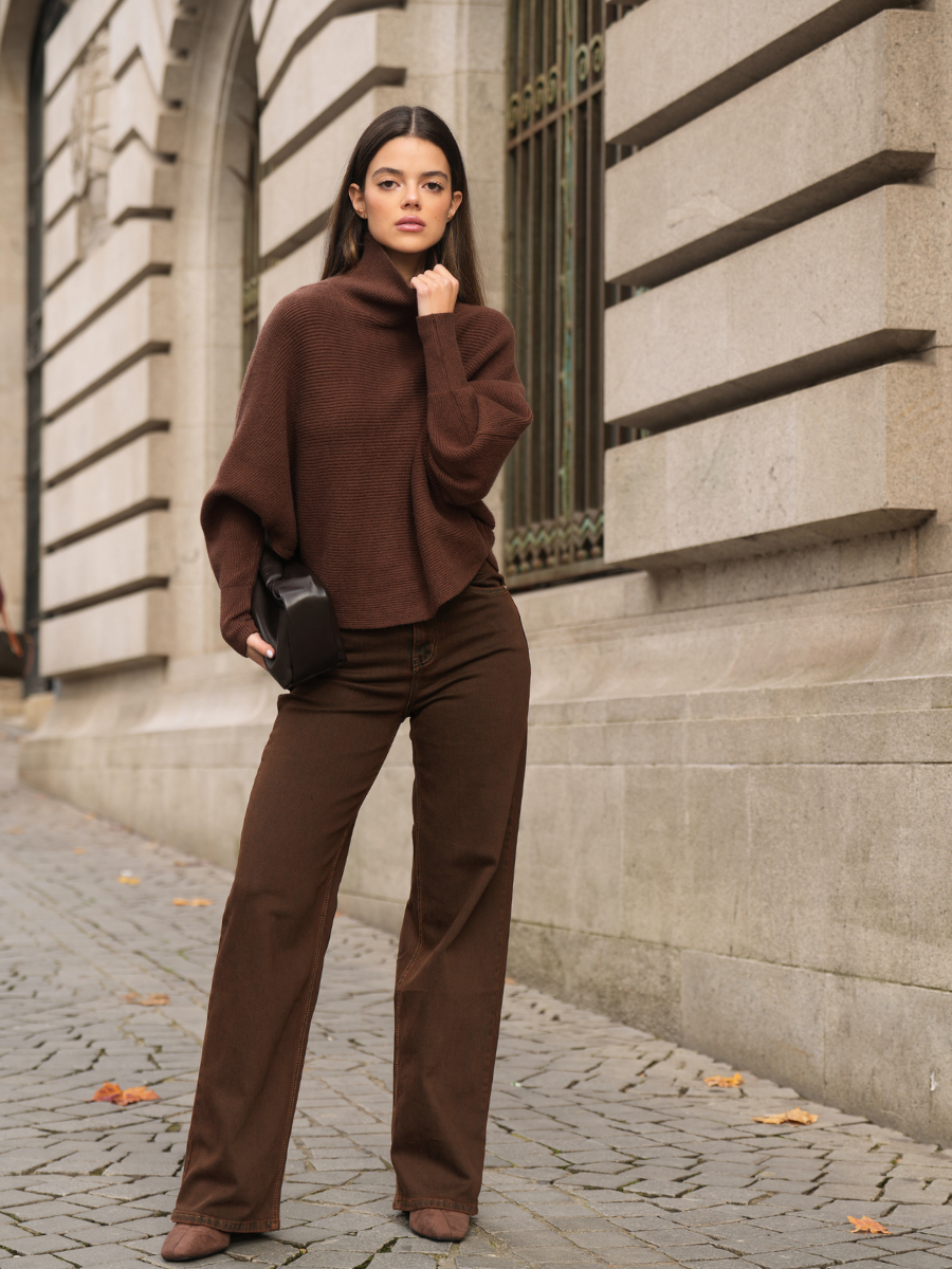 Um clássico renovado para os dias de outono. Estas jeans de perna larga destacam-se pelo tom castanho quente e pela estrutura fluída que alonga a silhueta. Com cintura subida, bolsos traseiros e detalhe de costura em contraste, são ideais para conjugar com camisas fluídas ou malhas justas. O corte reto a partir da anca proporciona um equilíbrio perfeito entre conforto e elegância, enquanto o tecido com ligeira elasticidade garante liberdade de movimentos. Versáteis e sofisticadas, adaptam-se tanto a looks de escritório como a coordenados urbanos com botas de salto.