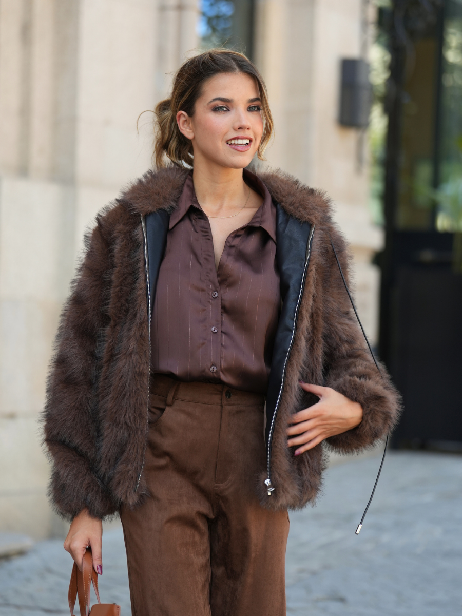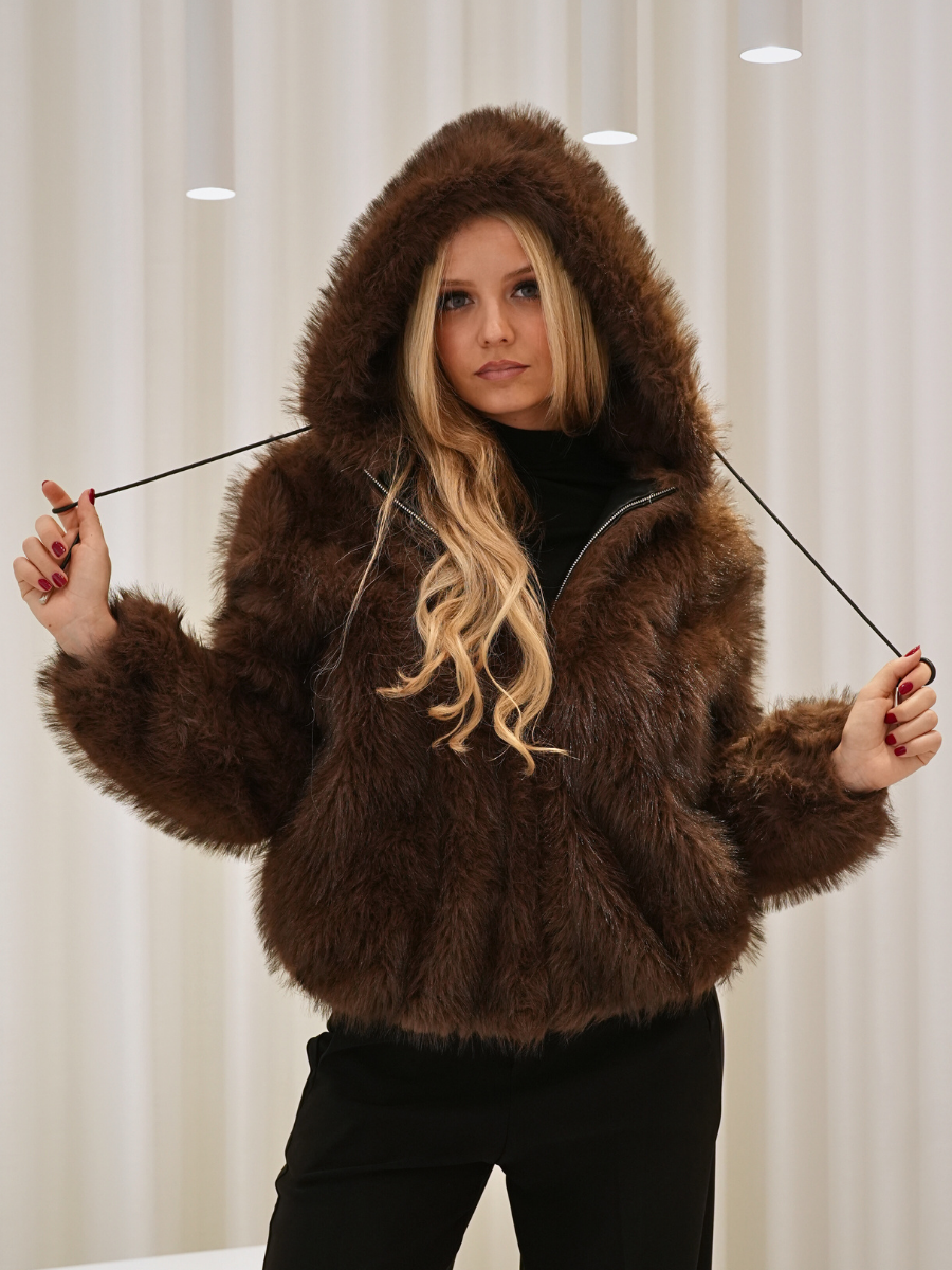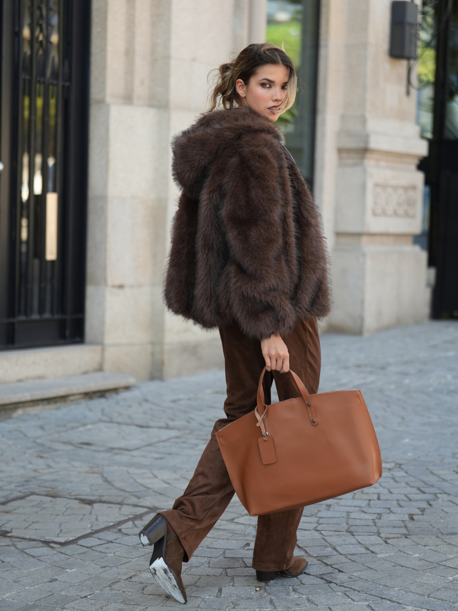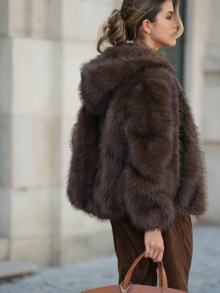 Casaco em pelo sintético textura longa e suave, em tom castanho médio. Modelo oversized com capuz volumoso e fecho frontal metálico. Interior forrado e acabamento de alta qualidade. Ideal para coordenados urbanos e confortáveis nos dias mais frios. O detalhe do capuz confere um toque moderno à silhueta clássica.