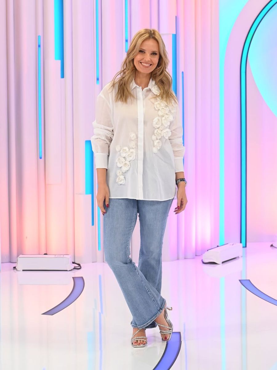 Jeans cintura subida. 4 bolsos. Pormenores de pedras preciosas nos bolsos traseiros. Presilhas. Perna larga.