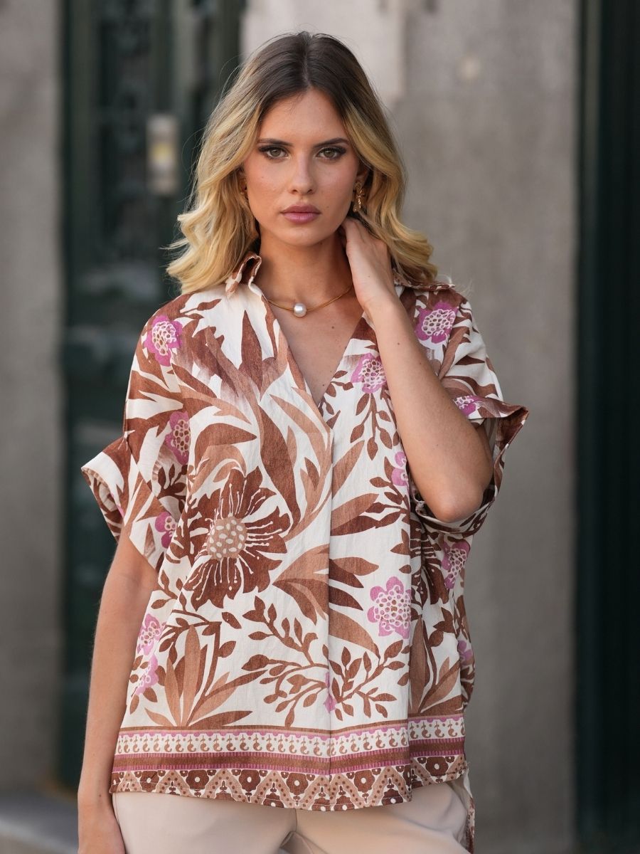 Manga curta. Decote em v com colarinho. Modelo leve e fluido.