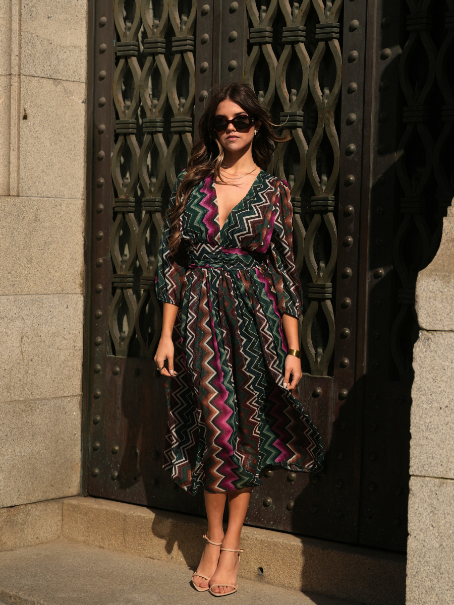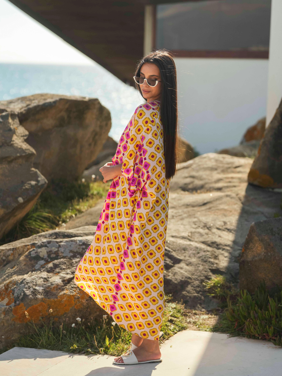 Padrão colorido e abstrato. Tecido com brilho. Decote em v. Manga comprida com punhos elásticos. Cintura com pormenor. Forro interior. Modelo comprido