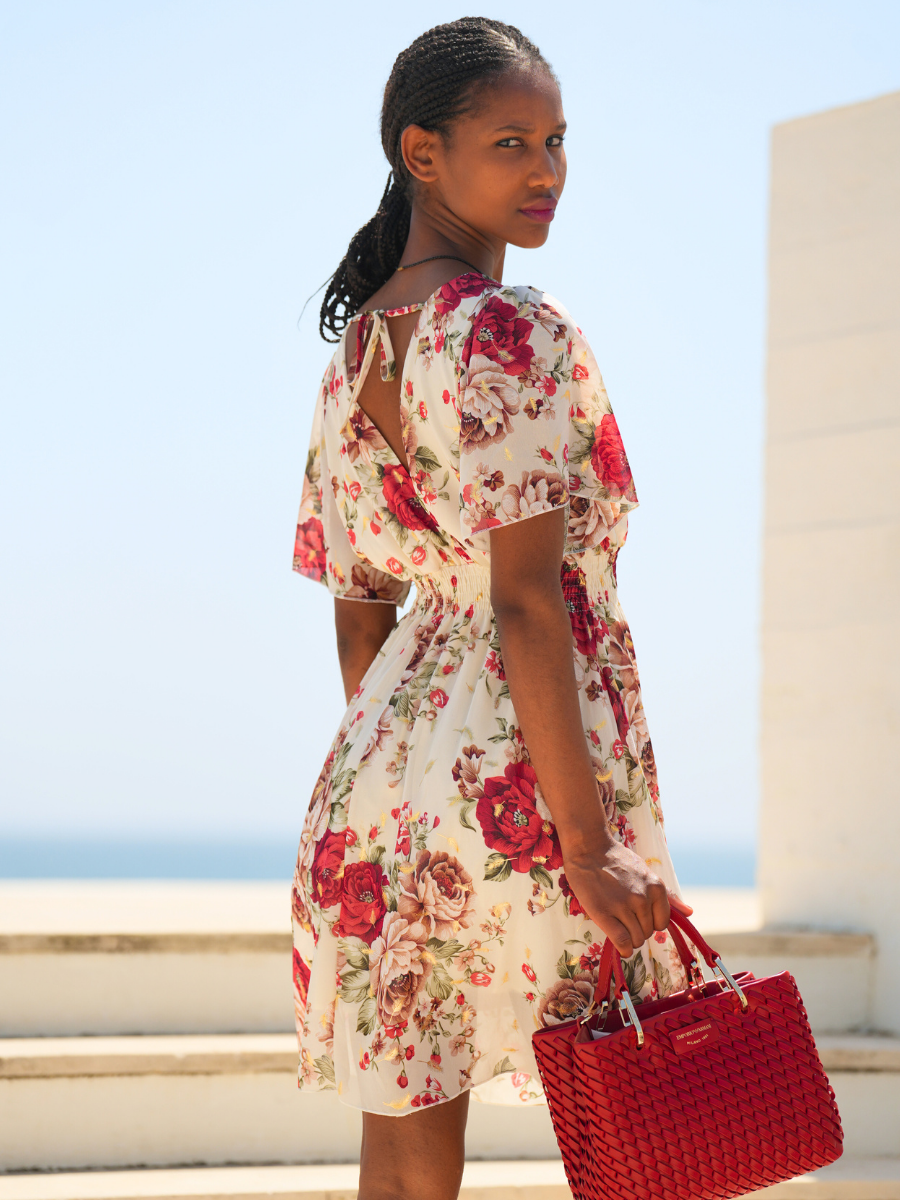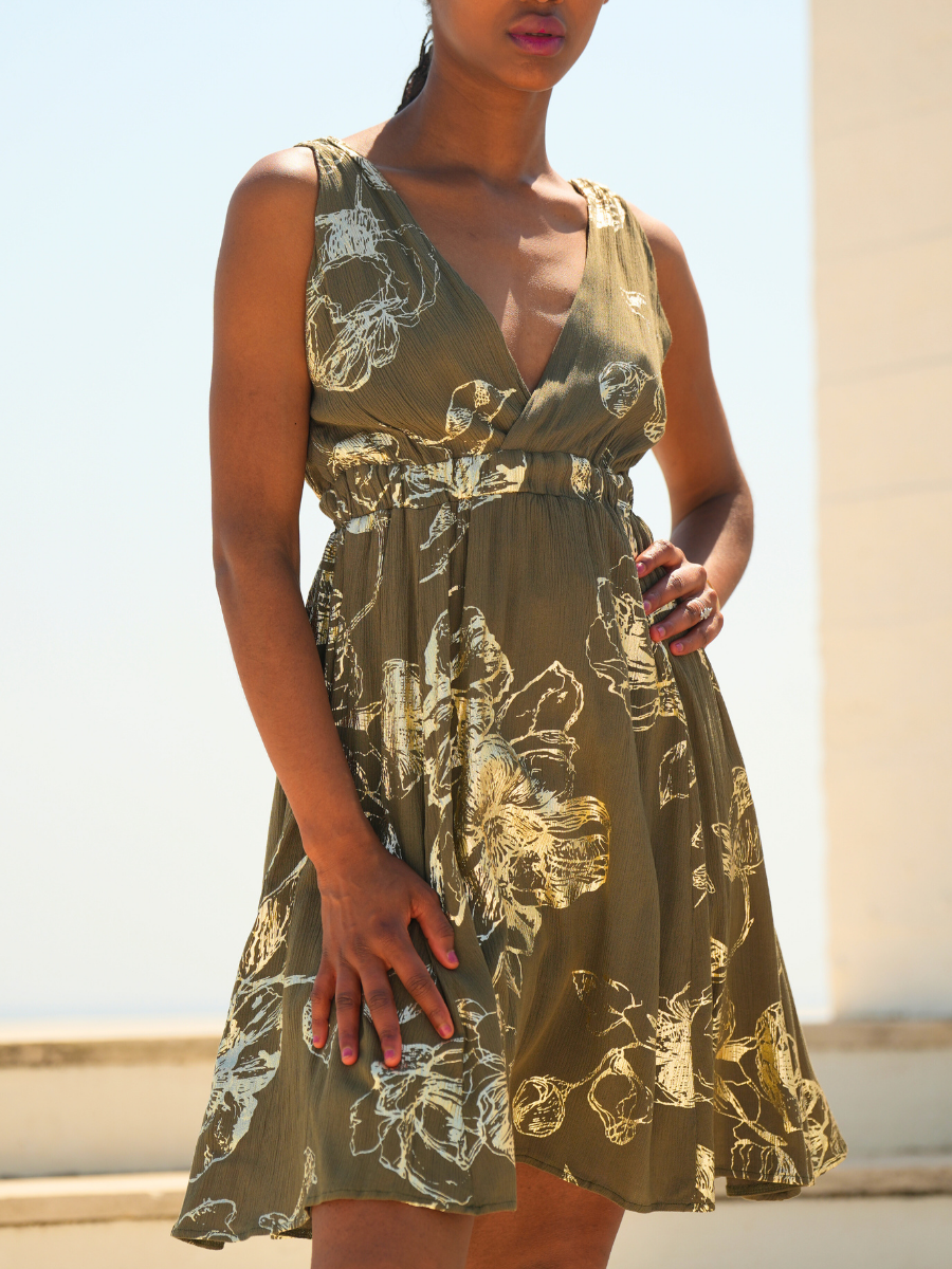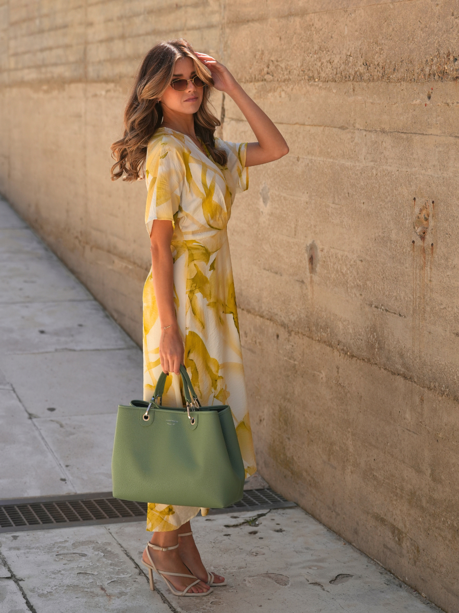 Leveza, cor e sofisticação num só vestido. Este modelo longo destaca-se pelo estampado floral com efeito aguarela e pela fluidez do tecido, perfeito para dias de sol. O decote cruzado e a cintura marcada criam uma silhueta feminina e elegante, ideal tanto para um passeio à beira-mar como para eventos de verão.