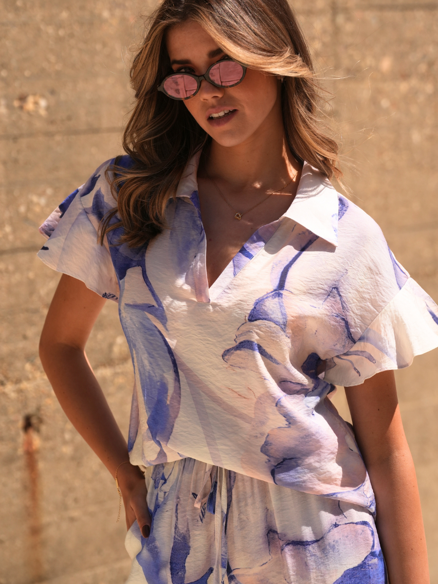 Com um corte leve e cheio de movimento, esta blusa é a escolha ideal para dias quentes com estilo. O tecido texturizado com acabamento vincado e a estampa floral aquarelada conferem um toque artístico e feminino à peça — perfeita para dar vida aos looks mais simples.