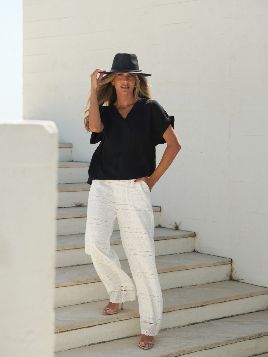 Com um toque exótico e descontraído, estas calças fluidas com estampado de palmeiras são perfeitas para dias quentes e ambientes tropicais. O corte largo e o tecido leve garantem conforto absoluto e movimento natural.