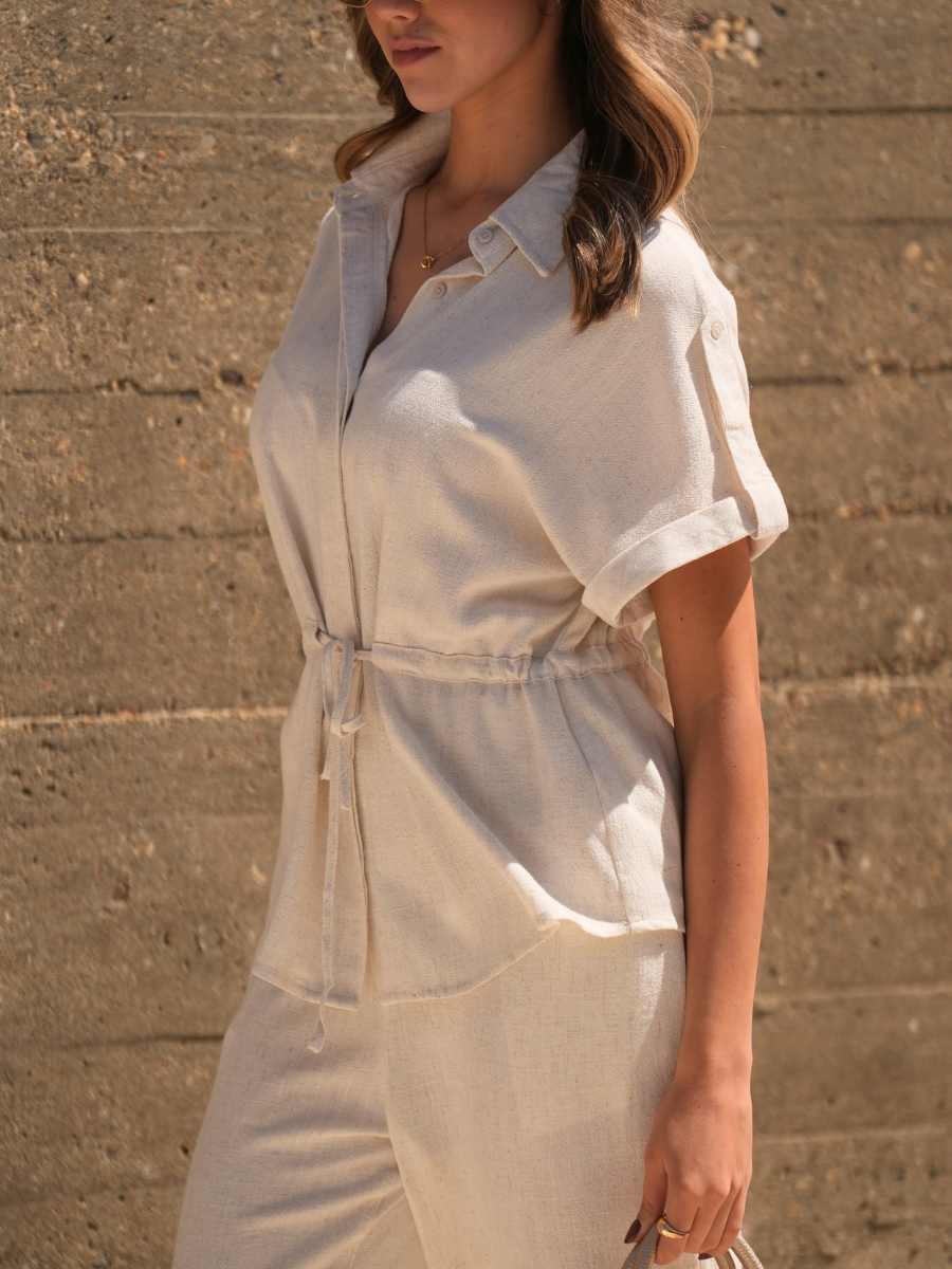 Macacão em linho com alças ajustáveis e recortes laterais. Um modelo sofisticado e descontraído , com corte reto e bolsos discretos que valorizam a silhueta.