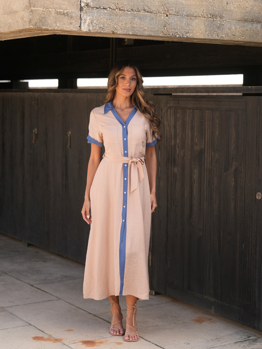 Vestido longo. Modelo de manga curta. Botões frontais ao longo de toda a peça e cinto no mesmo tecido para marcar a cintura. Confeccionado em tecido leve, com um corte fluido que proporciona conforto e movimento.
