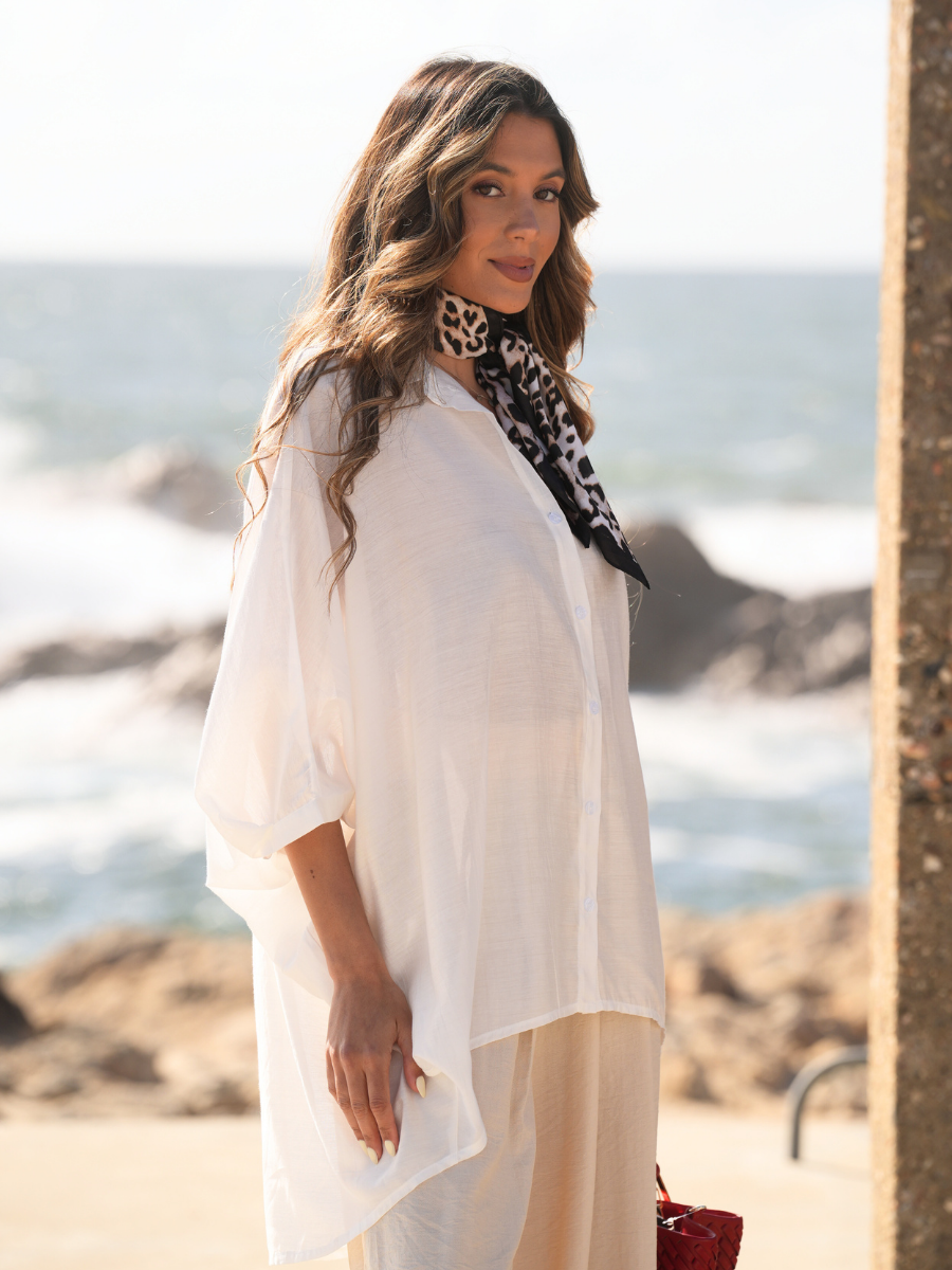 A intemporalidade da camisa com um toque leve e descontraído. Esta peça oversized eleva qualquer look de verão, mantendo o conforto e elegância em equilíbrio perfeito.