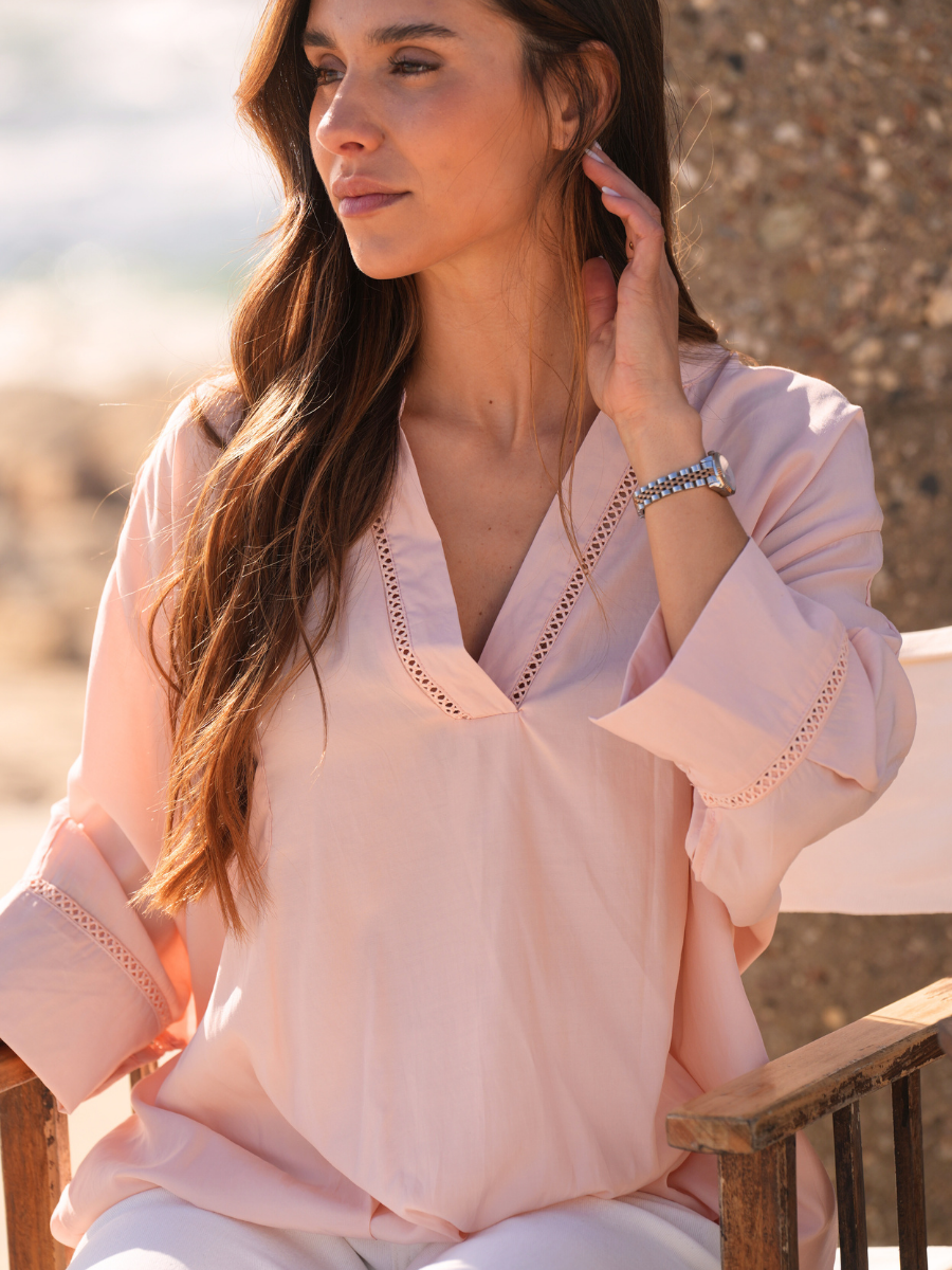 Top em tecido leve e fluido com decote em V e aplicação de renda delicada. Um essencial sofisticado para os dias mais quentes.