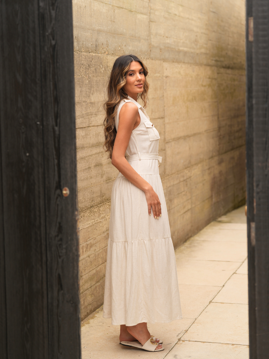 Vestido sem mangas em tecido leve, com botões dourados e cinto ajustável a marcar a cintura. Bolsos frontais e ombreiras com botão trazem um toque utilitário moderno. Ideal para looks de verão elegantes e descontraídos.