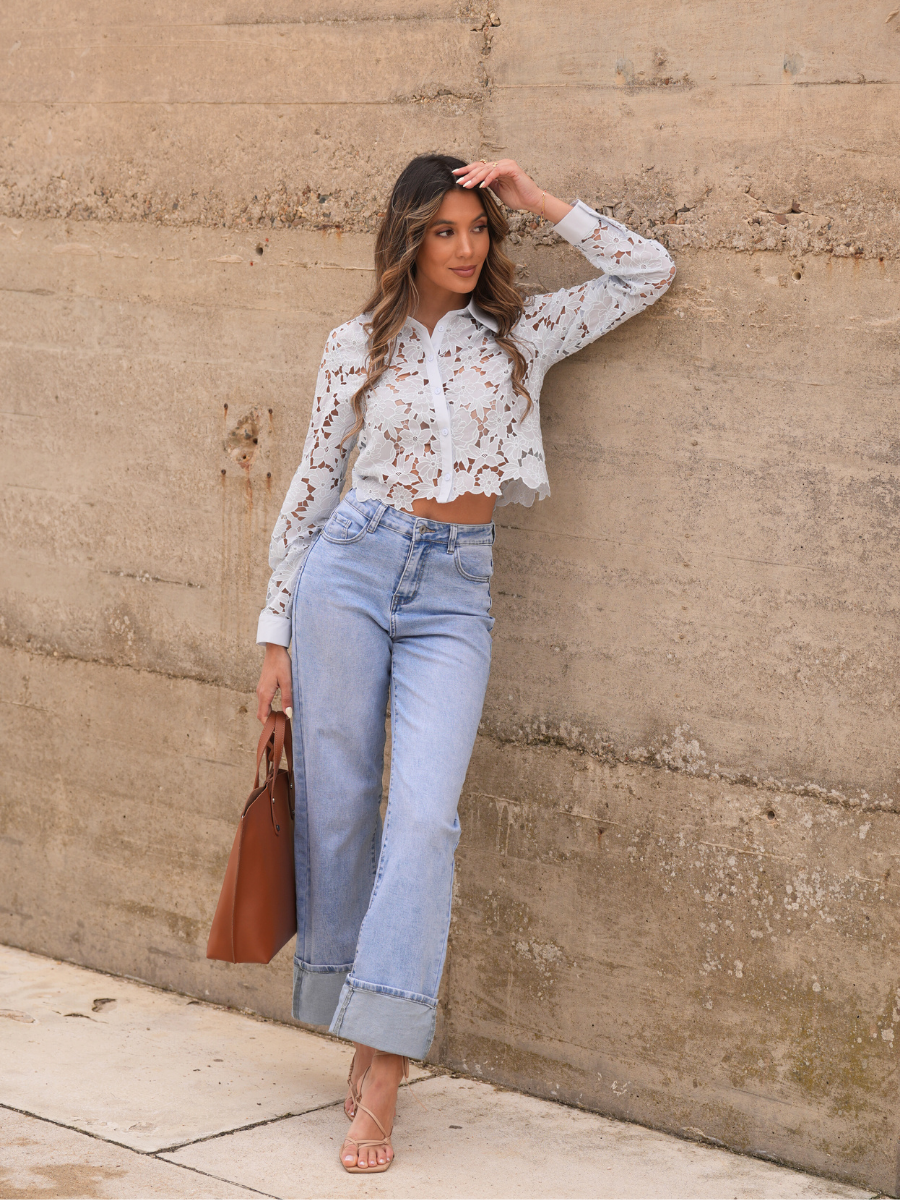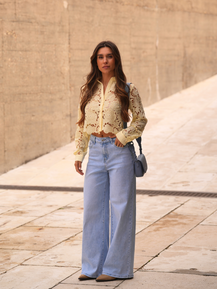 Jeans de cintura média confecionados em ganga azul clara. Modelo de corte reto e perna ampla, com acabamento de bainha dobrada para um toque contemporâneo. Fecho frontal com zíper e botão metálico. Aposte nesta peça versátil que combina conforto e tendência em todos os momentos.