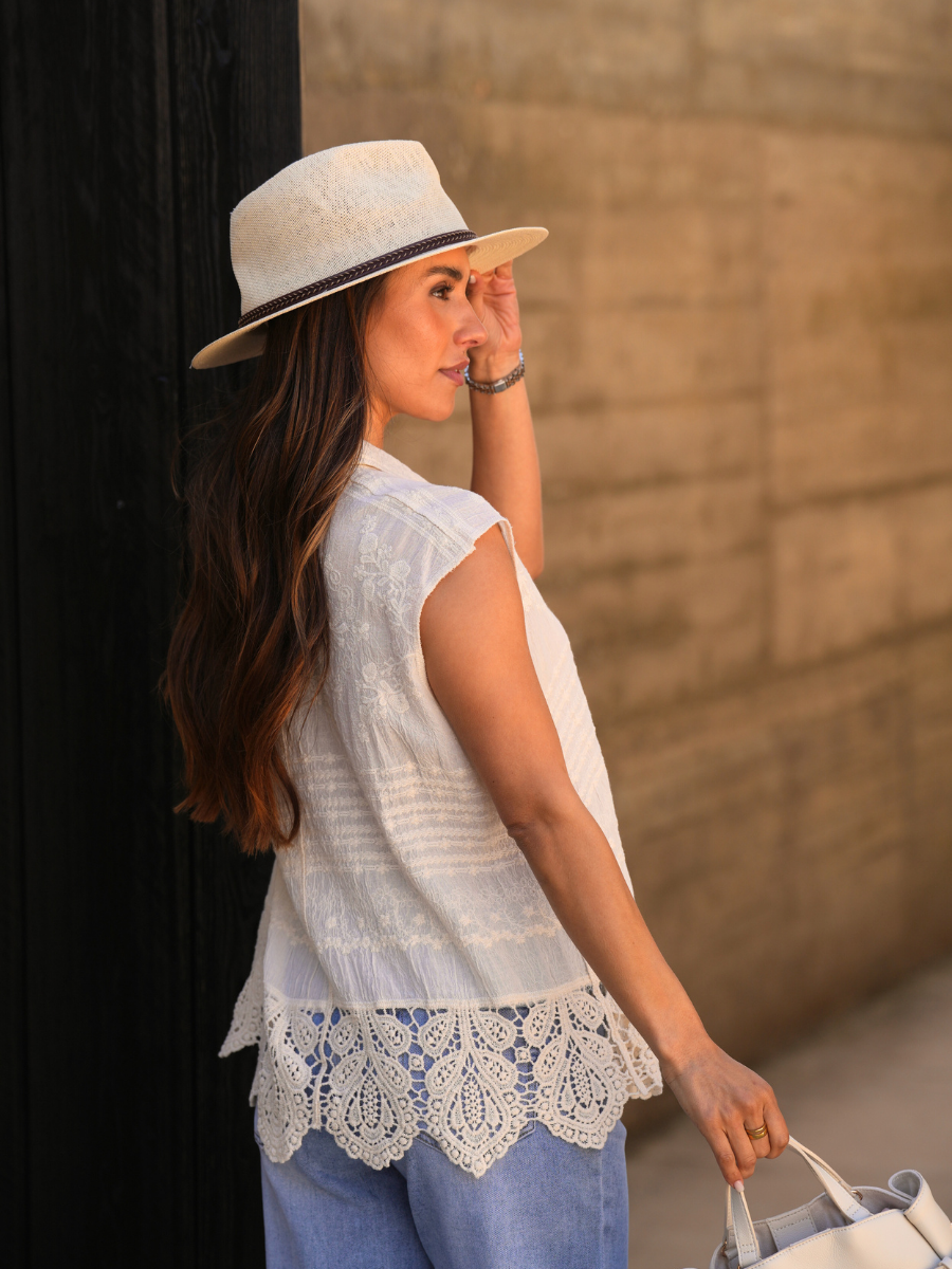 Top fluido de gola redonda e sem mangas. Aberturas de botões laterais que adicionam um toque moderno e elegante à peça. Corte reto e leve, ideal para looks de verão com estilo e conforto.