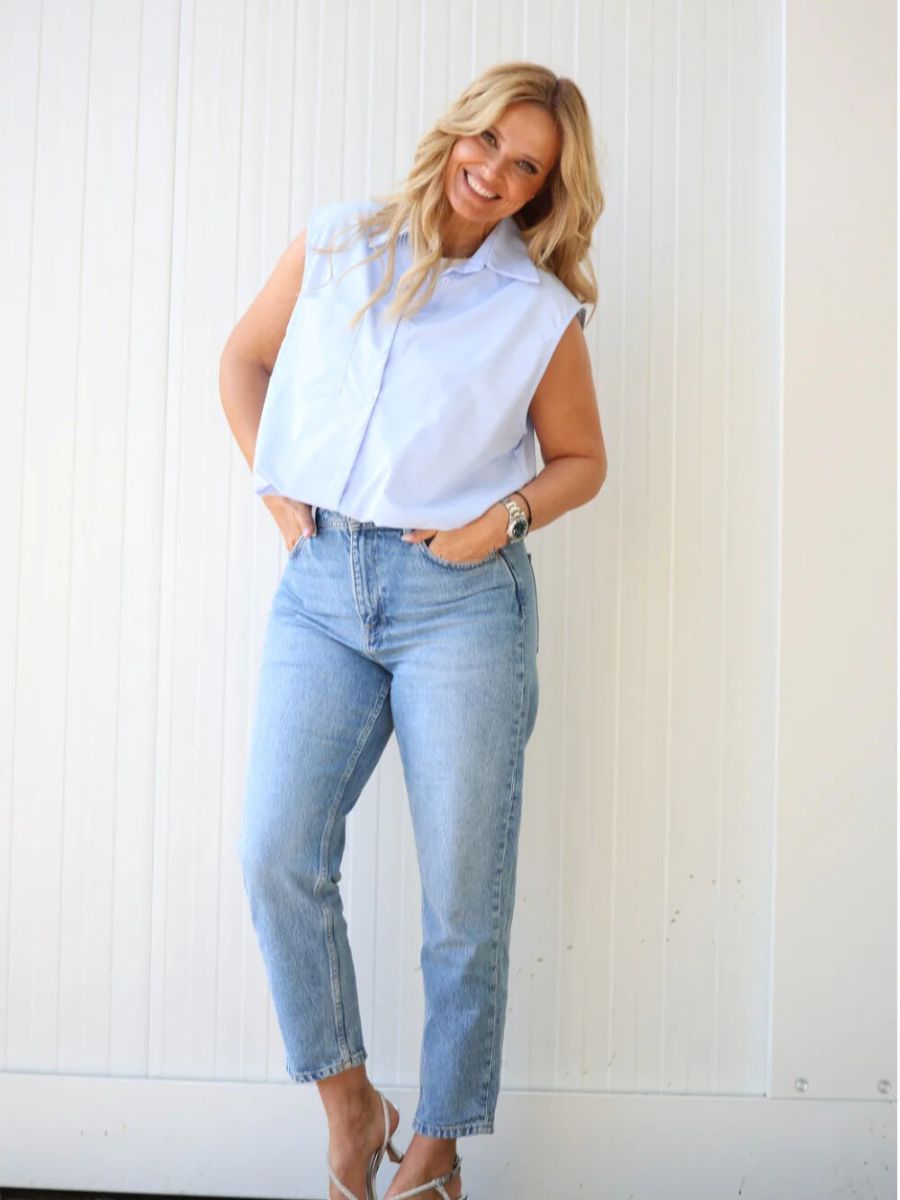 O top apresenta um corte reto e encurtado, ideal para looks de verão sofisticados. Tem gola clássica de camisa e é fechado à frente com botões metálicos discretos. Dois bolsos frontais com pala e botão acrescentam um toque utilitário ao design. As cavas amplas e a ausência de mangas conferem leveza e modernidade à peça, enquanto o tecido estruturado garante um caimento impecável.